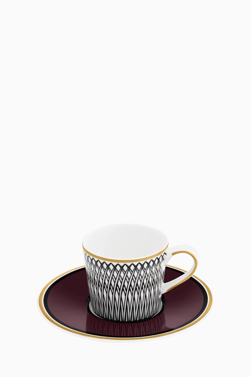 Crafted from fine bone china, the espresso cup and its matching 13cm saucer feature black curvy patterns and asymmetrical Art Nouveau lines set against a rich burgundy backdrop. A gold rim accentuates the design, adding a touch of opulence to every espresso moment.