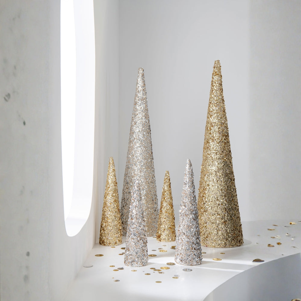 Crafted from lightweight foam and high-quality synthetic materials, the cone delivers a bold visual impact without added weight. The brilliant gold sequins reflect light beautifully, creating a radiant glow that enhances living rooms, entryways, tabletops, or seasonal arrangements.
