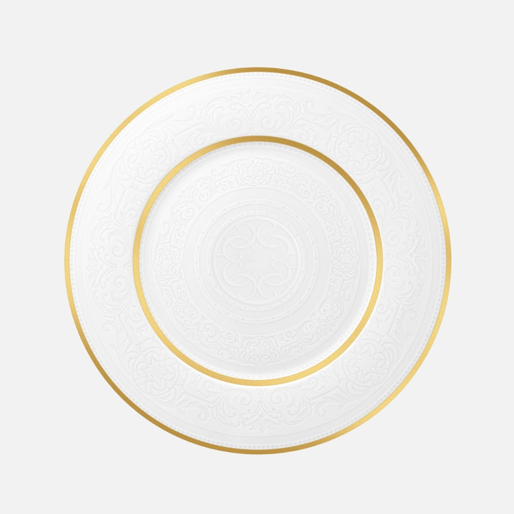 Elevate every place setting with this fine bone china charger, finished with a Baroque-inspired gold rim on a refined grey-and-white background. A timeless foundation for formal dining and elegant everyday meals.