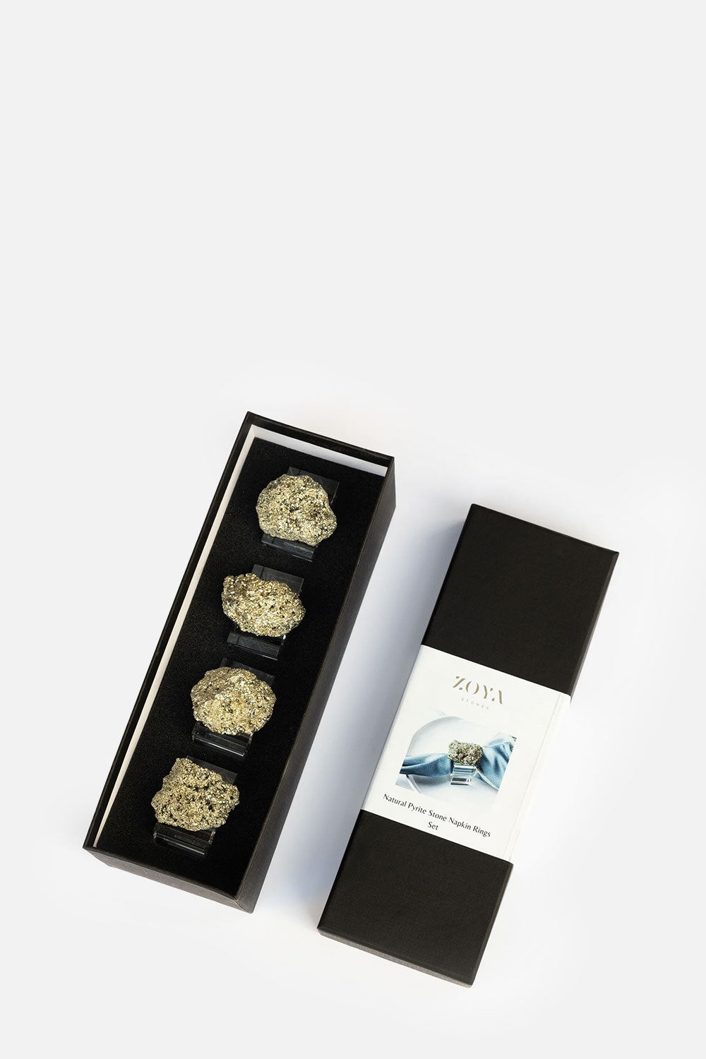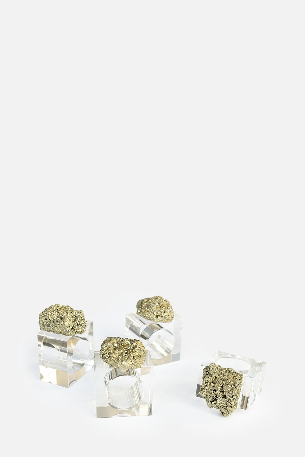 A set of four elegant napkin rings crafted from natural pyrite, adding a touch of sophistication and shimmer to any table setting.