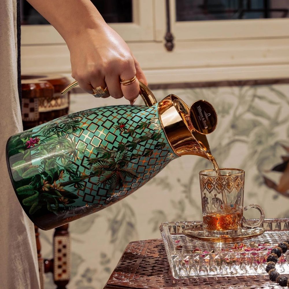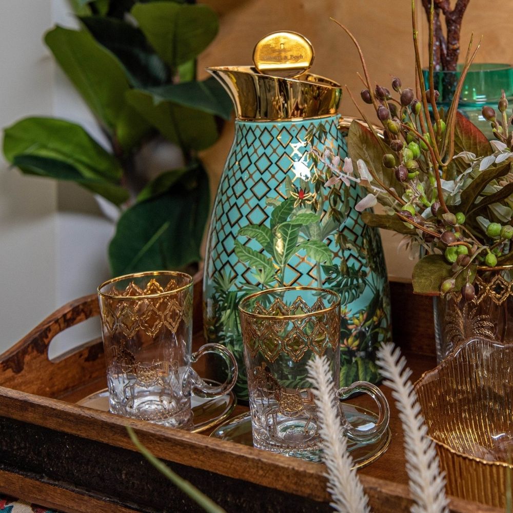 Each cup features a delicate horse motif and subtle gold detailing, exuding an aura of refined luxury. The golden rim adds an opulent touch, making this set ideal for both daily indulgence and formal occasions. Crafted from premium glass, the warm amber hue beautifully complements a variety of table settings, creating an inviting ambiance for serving Karak, Moroccan mint, black, or herbal teas.