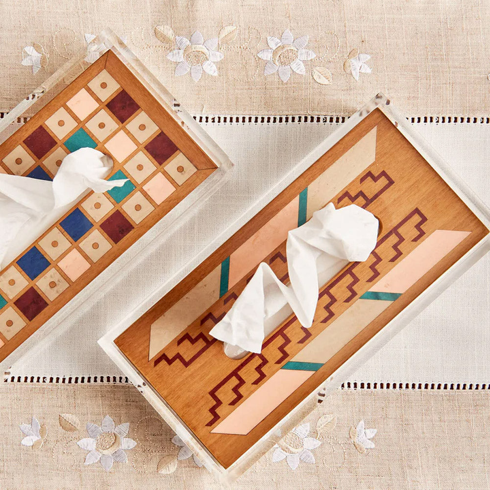 Bring a touch of refined elegance to your space with this beautifully crafted rectangular tissue box. Designed to accommodate standard tissue sizes, it features a sophisticated linear pattern that merges modern simplicity with artisanal craftsmanship. Built on a sturdy plexiglass base, the box is finished with Walnut marquetry using premium Italian veneers.