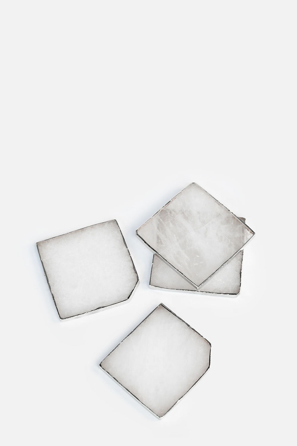 A sophisticated set of four White Quartz coasters finished with elegant silver edging. Each coaster highlights the natural charm and variation of raw quartz, making every piece one-of-a-kind.