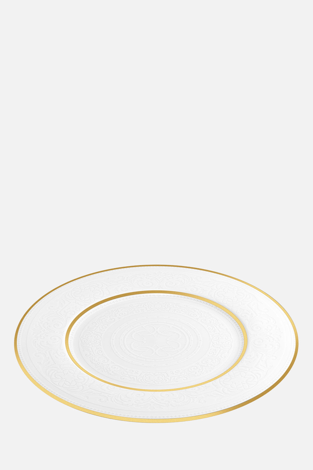 Elevate every place setting with this fine bone china charger, finished with a Baroque-inspired gold rim on a refined grey-and-white background. A timeless foundation for formal dining and elegant everyday meals.