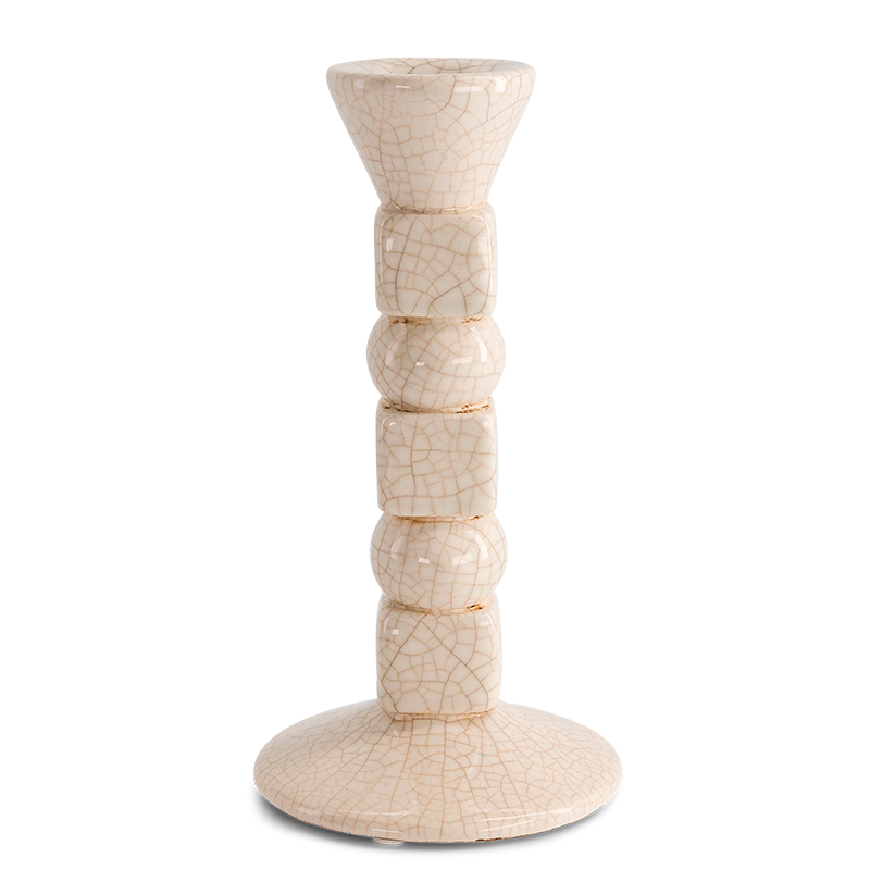 A sculptural ceramic candleholder in a soft cream white hue with crackled enamel finish. Part of The Socialite Family’s Anna collection. Elegant and decorative for tabletops, mantlepieces, or intimate dinners.