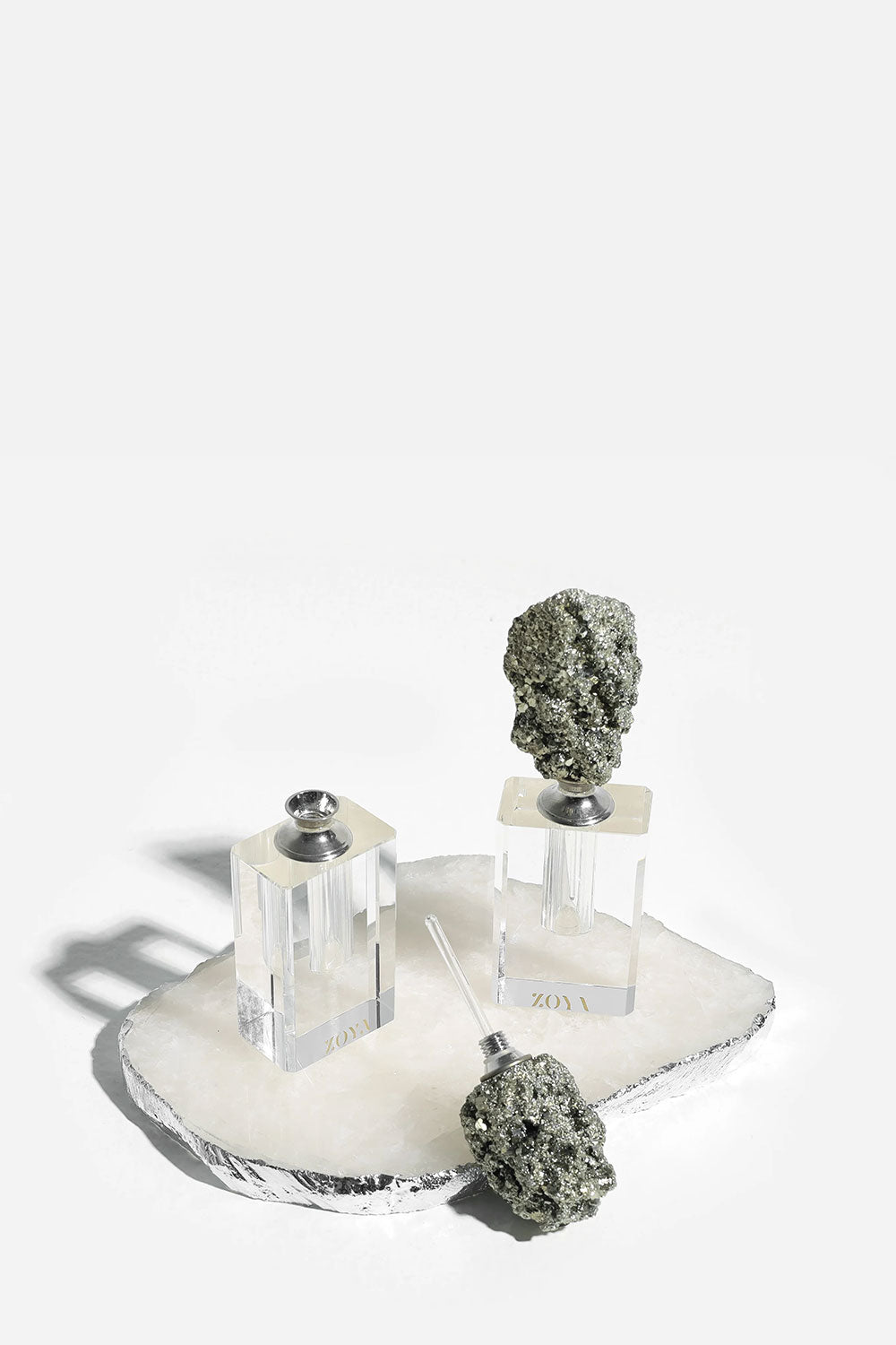 Material: Hand-carved natural stone bottles with glass vial inserts and pyrite gemstone toppers; White Quartz tray with silver detailing